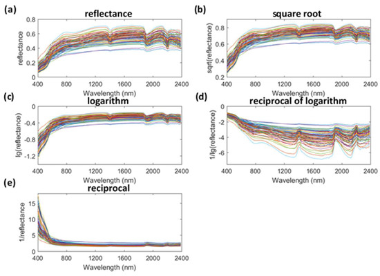 The original hyperspectral data and the associated four transformations: (a) original reflectance, (b) square root, (c) logarithm, (d) reciprocal of logarithm, and (e) reciprocal.