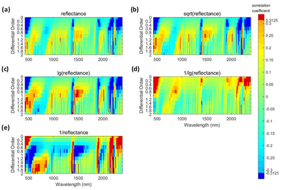 The correlation coefficients of hyperspectral reflectance data and the four transformations and different orders of differential operations applied: (a) reflectance, (b) square root, (c) logarithm, (d) reciprocal of logarithm, and (e) reciprocal. The x- and y-axes represent the wavelengths and fractional-orders (FOs) in differential operations from 0 to 2, respectively. The colors denote the correlation coefficients. For the soil sample size of 67, the absolute values of correlation coefficients greater than 0.3125 are considered to be significant (α = 0.01), which are denoted by deep blue and red in the color bar.