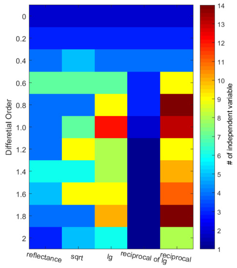 Figure 3 reveals that there were high redundancies in the data that were significantly correlated with Zn content. In this study, the redundancy and multicollinearity in each of the 55 types of spectra were removed. To remove the redundancy and multicollinearity, the wavelengths were first sifted by selecting those with local maxima in the absolute values of the correlation coefficients in one type of the spectral data. After this sifting, the VIFs were employed. The wavelengths were filtered sequentially until the VIFs of all the sifted wavelengths in one type of spectral data were less than 10. Figure 4 displays the numbers of sifted candidates for modeling in the 55 types of data. In total, 304 candidates were sifted from the 55 types of spectral data. Among the 55 types of data, the FOs ≥ 0.6 and the reciprocal transformation yielded relatively more candidates than others. For example, there were 14 candidates in FO = 0.8 and FO = 1.8 of reciprocal. In contrast, there was only one candidate in FOs = 1.2 to 2 of the reciprocal of the logarithm. A flowchart showing the methods in this study is provided in Figure 5.