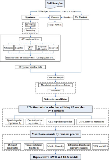 Since there are global and local properties in soils, both OLS and GWR models were employed to detect possible relationships between hyperspectral data and soil Zn content. Through two-step data sifting by finding the wavelengths with local maximum in absolute values of correlation coefficient with Zn content and by applying the VIFs, a total of 304 candidates were sifted from the reflectance and transformed variables, with more candidates in reciprocal transformation and FOs ≥ 0.6. It was shown that a modeling sample size of 46 might be insufficient to build the appropriate OLS and GWR models, so four methods using all 67 samples were used to select effective independent variables for GWR modeling. Finally, with the assistance of a random process in the comparison of verification effect, representative OLS and GWR models were obtained, with four variates selected through a GWR stepwise regression.
