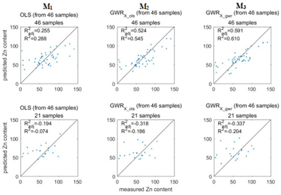 The performance of the representative GWR and OLS models for the 67 samples: 9 samples with Zn content <25 mg/kg and 58 samples with Zn content >25 mg/kg.