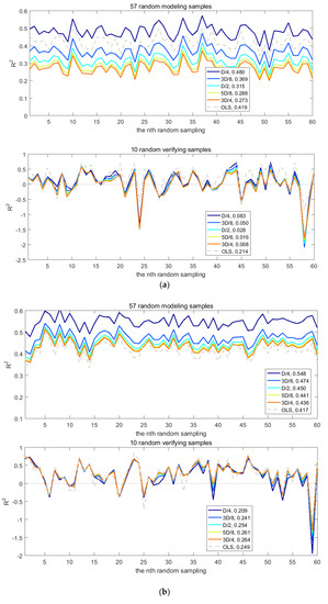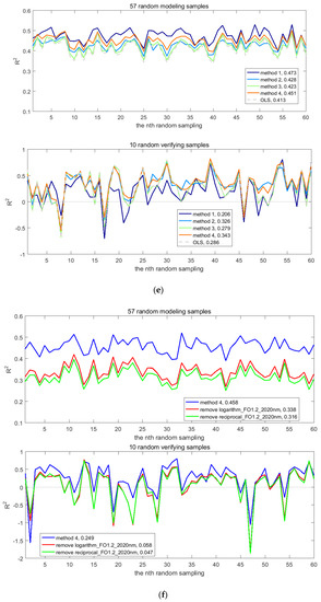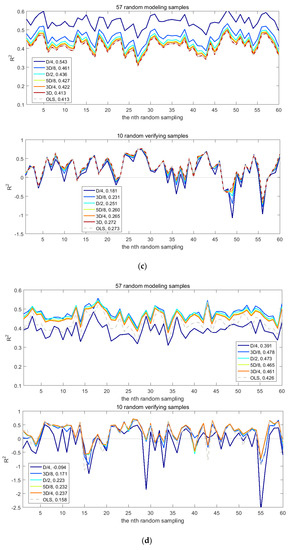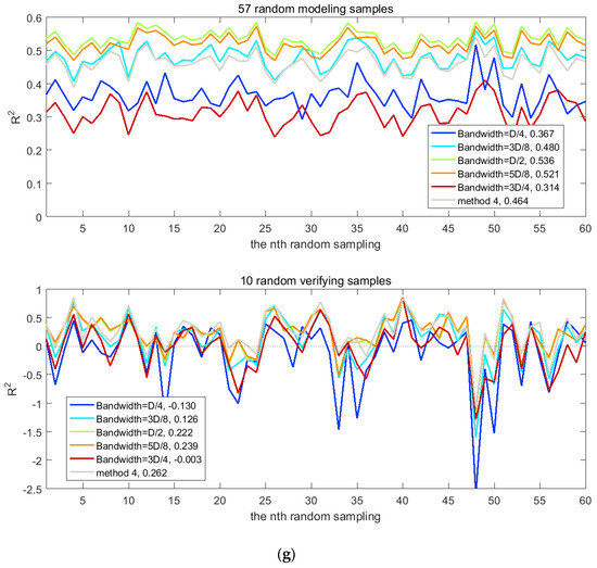 The results of the 60-repetition random processes by repeatedly selecting 57 samples for modeling and 10 samples for validation. The top and bottom panels display the 60 repetitions of the modeling results from the 57 randomly-picked samples and verification results from the left 10 samples, respectively. Values in the legend represent the associated mean R2 of the 60-repetition random process. (a) The GWR models with two variates (D/4) in Method 1 and with bandwidths changing from D/4 to 3D/4; (b) the GWR models with four variates (3D/4) in Method 2 and with bandwidths changing from D/4 to 3D/4; (c) the GWR models with four variates obtained by OLS stepwise regression and with bandwidths changing from D/4 to 3D; (d) the GWR models with variates obtained by GWR stepwise regression for different bandwidths from D/4 to 3D/4 as shown in Table 6; (e) the GWR models with the superior mean Rv2 in Methods 1–4; (f) the GWR model with the superior mean Rv2 in Method 4, and those with one of the two variates x3 and x4 removed; and (g) the GWR models with variates of IO derivatives obtained by GWR stepwise regression for different bandwidths from D/4 to 3D/4 as shown in Table 7. In (a)–(e), the OLS models in Method 3 are compared with the GWR models, whereas in (f) and (g), the GWR models with the superior mean Rv2 in Method 4 are compared to the other GWR models.