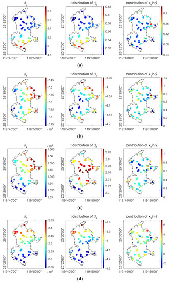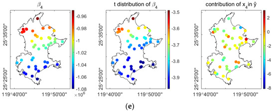From Section 3.3., an OLS model and a GWR model (bandwidth 3D/4) with four variates using Method 4 were chosen to be the representative models for soil Zn content estimation on Pingtan Island, as they produced superior mean verification results compared to the other studied models. To compare the performance of the two models, the parameter estimates, standard errors (SE), and t-values for the OLS model are outlined in Table 9. Figure 8 displays the spatial distributions of the parameter estimates, associated t-values, and contributions of Cik of each variate in the predicted Zn content ŷ for the GWR model. The contribution Cik is: