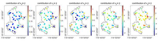 In the parameter estimates, the negative degree is larger in the south and smaller in the north. As x3 and x4 are different only in the reciprocal and logarithm transformations, and both β3 and β4 are negative, there are opposite polarities in the contributions of x3 and x4 in the predicted Zn content. Many samples have contributions greater than 1 or less than –1 in x3 and x4, and more than 73% range from 0 to 3 and from –3 to 0, respectively. Figure 7f shows that the model with four variates is better than those with one of x3 or x4 removed during verification. Figure 9 displays the spatial distributions of Cik for the intercept and the four variates in the OLS model. The trends in Cik of the five terms in both models are not as clear as in the parameter estimates and t-values, and the five distributions of Cik in the OLS model agree with those in the GWR model in general.