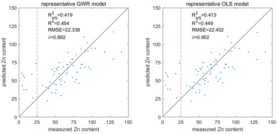 Scatter plots of the representative GWR (left panel) and OLS (right panel) models constructed using the 67 samples. The Radj2, R2, RMSE, and average relative error δ calculated using the 67 samples are shown in the top of two panels. The red dashed vertical line indicates the measured Zn content of 25 mg/kg.