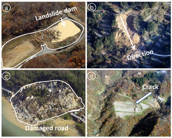 Illustrating the characteristics and different types of landslides in the study area: (a) shallow spread in the north of the Hitotsuminesawa with water, Nagaoka city; (b) rotational soil slide in north of Mushigame; (c) bedrock collapse severely destroyed the road in Nagaoka; (d) translational slide, an arrow display secondary scarp in the Uonuma city (Images provided by NIED).