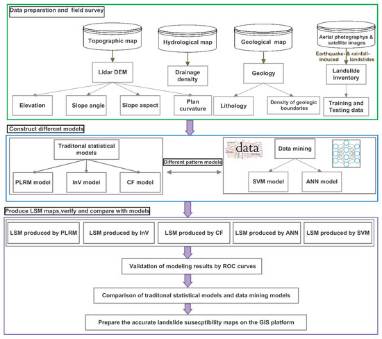 The framework for the LSM in this research is depicted in Figure 3. Initially, the earthquake- and rainfall-induced landslides were delineated by interpreting multiple aerial photographs, satellite imageries and ground truths to construct a comprehensive landslide inventory for the study area. This database includes the landslide inventories provided by the National Research Institute for Earth Science and Disaster Prevention (NIED), Japan, as well as those prepared by the first author. Next, the relationship between landslide distribution and the causative mechanism were analyzed. Thereafter, the LSM maps were produced by traditional statistical models and data mining techniques, respectively. At last, the five models were examined and verified for accuracy using the receiver operating characteristic curve (ROC) function.