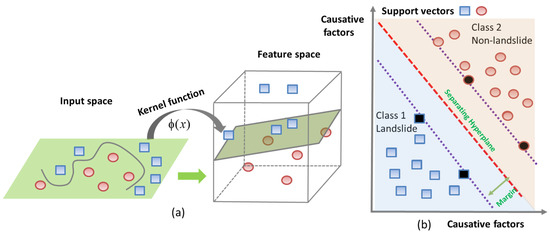 Illustration of support vector machine (SVM) principle: (a) Input space is mapped to the feature space with the help of a kernel function; (b) Separating hyperplane and margin for landslide classification.