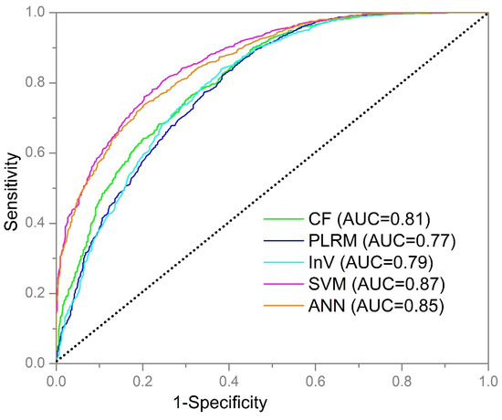 Apart from the models what we have compared in this study, there are other more sophisticated approaches are mentioned in the recent literature [74]. Indeed, the comparison of different machine learning models and their performance issues has become a trend in the LSM studies [11,74] However, assessment of model performance not only depends on the methods, but also it is mainly decided by the quality of the collected data [56]. For example, a random forest (RF) model applied using historical 222 landslides in Jiangxi, China with the help of 25 m DEM returned only a ROC value of 0.75 [75]. On a similar note, Dou et al. [34] studied the Osado Island adjoining Niigata using ANN and a 10 m DEM returned a ROC value lower than that achieved for this study. In another example, a case study of the Cameron Highlands, Malaysia using 11 landslide factors and 81 landslide locations by SVM approach achieved maximum accuracy of 0.81 only [76] Thus, the quality of the landslide inventory and high-resolution conditioning factors are important to all statistical models. The current research utilized fine aerial photographs and LiDAR-derived data for conditioning the input variables. This study, regardless of applying multi-event type landslides and traditional machine learning techniques, therefore, achieved a better performance using high-quality dataset.