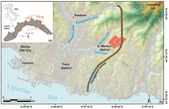 The area of interest (approximately 10 km2) is located on the eastern side of the city, in the lower part of the Bisagno river catchment, more precisely in the San Martino district (Figure 1). Autonomous municipality until 1873, it became part of the great urban area of Genoa in 1926. It experienced intense urbanization, transforming itself into a densely inhabited residential area, well known for its large hospital complex, which is the main Genoa one. The newly built Fereggiano tunnel section runs mostly under this area coming from the Fereggiano valley, passing the underground railway line and going to reconnect to the pre-existing tunnel section linked to the sea (Figure 1).