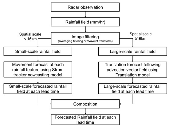 The first QPF was generated by the Spatial-scale Decomposition method (SCDM) used to forecast differential motions (such as for convective or stratiform cells) in the same precipitation system, following the procedures shown in Figure 1. The rainfall field was separated using image filtering, the movement of small-scale rainfall fields (<16 km) was forecasted by a nowcasting model, and the advection vector of large-scale rainfall fields was estimated by a translation model, then each forecasted field was composited. The smaller-scale convective cells (~2–20 km) had shorter life spans and less predictability than the larger storm envelopes (~20–200 km). The shorter predictability of the small-scale features is directly related to their differential advection velocities and the growth and decay process occurring inside the storm [15].