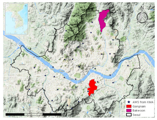 Boundary of the Seoul metropolitan area for which quantitative precipitation forecasts (QPFs) were obtained, locations of Korea Meteorological Administration’ (KMA’s) automatic weather stations (AWS), and boundaries of the Gangnam and Bakwoon basins studied in detail.