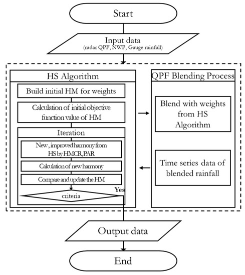 We developed an adaptive blending method to find the optimal weight for real-time blending of the three QPFs at each forecast time using the harmony search (HS) method. This is a metaheuristic music-inspired algorithm used to solve a wide range of optimization problems in different fields [25,26,27,28]. When musicians compose a harmony, they test various possible combinations of the pitches stored in their memory, which can be considered as an optimization process that adjusts the input (pitches) to obtain the optimal output (perfect harmony). This approach has two essential parameters: the harmony memory considering rate (HMCR) and the pitch adjusting rate (PAR).