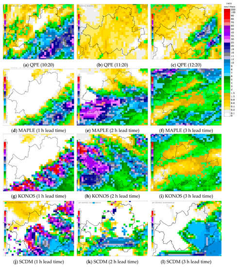 Comparison between actual quantitative precipitation estimates (QPE, a–c) and QPF forecasts by the radar-based McGill Algorithm for Prediction Nowcasting by Lagrangian Extrapolation (MAPLE) (d–f), KOrea NOwcasting System (KONOS) (g–i), and Spatial-scale Decomposition method (SCDM) (j–l) models in the Seoul area with lead times of 1–3 h starting from 09:20, 5 July 2016.