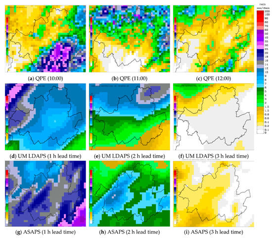Comparison between actual quantitative precipitation estimates (QPE, a–c) and QPF forecasts by the numerical weather prediction (NWP) models Unified Model Local Data Assimilation and Prediction (UM LDAPS) (d–f) and Advanced Storm-scale Analysis and Prediction System (ASAPS) (g–i) in the Seoul area with lead times of 1–3 h starting from 09:00, 5 July 2016.