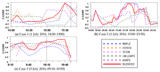 Accuracy evaluations (by correlation coefficient) for real-time QPF produced by the five tested models and the blended approach for all three cases. Grey line marks peak actual precipitation. (a) Case 1; (b) Case 2; (c) Case 3
