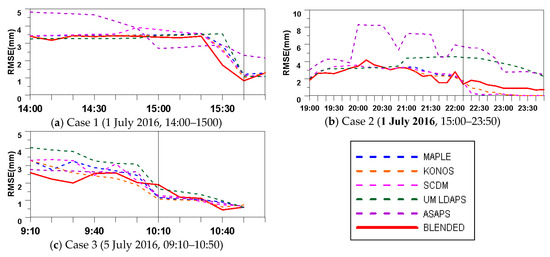 Accuracy evaluations (by root mean square error) for real-time QPF produced by the five tested models and the blended approach for all three cases. Grey line marks peak actual precipitation. (a) Case 1; (b) Case 2; (c) Case 3