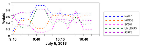The RMSE for all QPFs became smaller over time (Figure 7). As the analysis periods ran from the beginning to the end of precipitation, the RMSE naturally declined due to the smaller amount of rainfall at termination. Therefore, we analyzed errors between the QPFs relative to the computation time rather than as the absolute RMSE at each computation time. The RMSE of the ASAPS QPF had larger fluctuations in Cases 1 and 2 at each computation time, while the variations in RMSE for the three radar-based QPFs were similar and not larger than those of the NWP QPFs. The RMSE of the blended QPF tended to match that of the radar based QPFs; in Cases 1 and 2, the RMSE of the blended QPF was lowest at the time of maximum rainfall occurrence. Figure 8 shows the time series of the weights of all models estimated from the HS method for Case 3; the blended QPF is estimated using these weights.