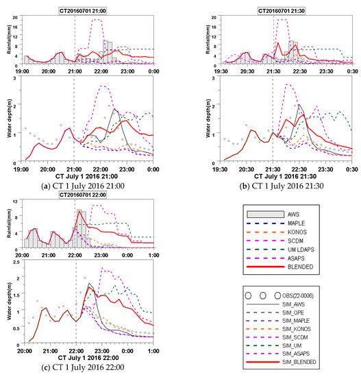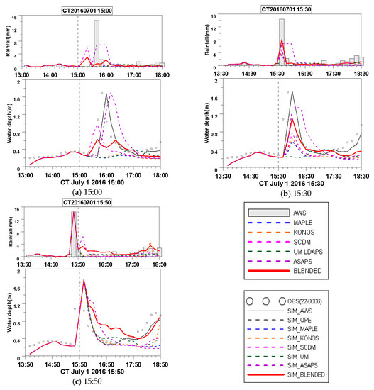 The three previously defined cases were used for evaluation of urban runoff forecasting with the rainfall input for the SWMM model produced by QPE and QPF at each current time (CT) for 3 h ahead of forecast. Figure 10 compares the observed and simulated depths using all QPFs for Case 1 from 14:00–15:50. The ASAPS QPF effectively simulated the peak water depth occurrence time and water depth change patterns. In addition, the blended QPF showed the second-best simulation results at 15:30 and 15:50. The radar-based and UM LDAS QPFs could not accurately simulate the peak flow and showed significantly lower simulated sewer water depths. Statistical evaluations showed that the relative error of peak depth (REPD) for ASAPS was the lowest (−19.11% to 11.66%) of all QPFs while RMSE for the blended model was lowest (0.33–0.38) (Table 1).