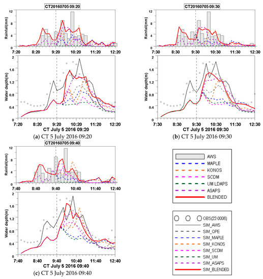 Figure 12 compares results for Case 3 at 09:20, 09:30, and 09:40. The blended QPF and ASAPS had higher accuracy than those the other QPFs in terms of peak water depth occurrence time and peak water depth. In particular, since the merged QPF is affected by the radar QPF (updated every 10 min), it follows the temporal variation of the rainfall more than the ASAPS, which updates every hour. All evaluation indicators showed good results for blended QPF (Table 3).