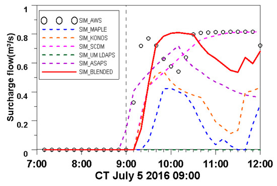Figure 14 shows the surcharge flow from the manhole where the maximum amount of overflow occurred (red star of Figure 12) as simulated by all QPFs and AWSs. As there was no water depth observation station in the Bakwoon basin, we compared simulated surcharge flow using AWS data. The blended model is most similar to the rain gauge data in terms of peak surcharge flow and timing.