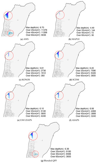 The forecasting results showed a maximum inundation depth for the blended QPF of 6.36 m, close to the AWS result (6.70 m) (Table 4). For the AWS result, the inundated area exceeding 20 cm depth was 11,376 m2 and the blended result was a similar 9180 m2. The inundated areas of the other QPFs were much smaller than the AWS result. For the inundated area exceeding 40 cm, all QPF results were considerably smaller than the AWS result; the blended QPF’s inundated area was 6588 m2, about 40% smaller than the AWS result. These results confirm the usefulness of the blended QPF approach for urban flood forecasting. However, future research should consider the data period used for blending the weight and production time of the forecasting model, considering the influence of past forecast errors when estimated the blending weights and the influence of different forecasting techniques.