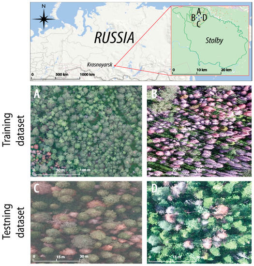 Location of the four plots in the nature reserve “Stolby,” Krasnoyarsk city (Russia), where A, B plots are fragments from the orthophotos used to build the training dataset; and C, D plots are fragments from the orthophotos used to build the testing dataset used for external validation or independent testing.