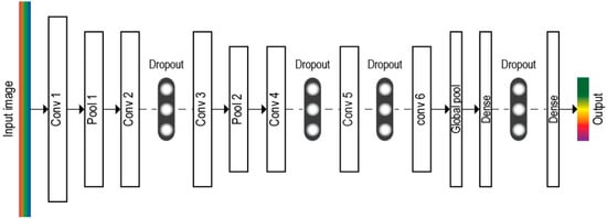 The overall architecture of the CNN (Table 3, Figure 3) consisted of six convolutional blocks (each includes one convolutional layer). Additionally, the first and third convolutional blocks included maximum pooling layers. At the top of the CNN, there are two fully connected layers and one output layer. The ReLU activation function was used in the last four convolutional blocks and the Softmax function for the output layer. In order to keep the overtraining of the network under control, we used the Dropout regularization method which reduced the complexity of the model, saving the number of its parameters low. It is very important to choose an appropriate regularization coefficient, so it was set to 0.25 after the second, fourth and fifth layers and it was set to 0.5 before the output layer. Our network with various activation functions is presented in Table 3.