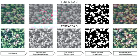 Pre-processing consisted of the following steps: first, converting the three band image into one grey-scale band image (PAN); second, converting grey-scale band image into blurred image; third, converting the blurred image into a binary image based on a 100 over 256 digital value threshold; and fourth, detecting categories of trees on RGB images. The 48 candidate patches identified in test area C and 40 candidate patches identified in test area D are labelled with red contour in the right panel.