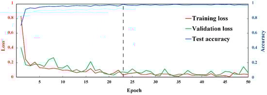 The maximum performance of our CNN model with augmented dataset was achieved at the 23th training epoch, providing an internal test accuracy of 99.7% and a minimum training loss lower than 0.01. After the 23th epoch, the validation loss was stabilized and the difference between the training and validation loss increased (Figure 5).