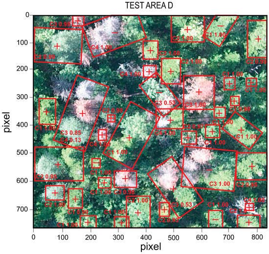 The results of the detection on the input test areas C and D are shown in Figure 7 and Figure 8. The red boxes present the selected areas produced by our candidate selection technique (see Section 5.4). Each red box has two numbers. The first number is the tree category estimated by the CNN model; C1, C2, C3 and C4 refer to the tree damage categories 1, 2, 3 and 4 respectively. The second number indicates the probability calculated by our classification CNN model. Actually, this probability indicates the level of confidence of the model.