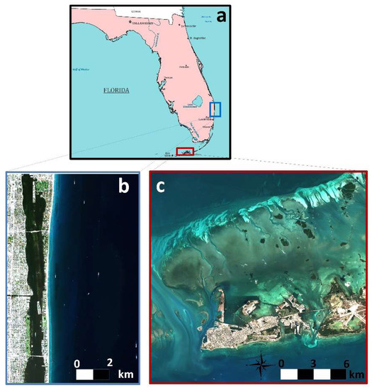 (a) Location of the study regions in South Florida coastal waters (United States). (b) Red-green-blue (RGB) composite after atmospheric correction of Sentinel-2A imagery on 6 January 2017 in West Palm Beach. (c) RGB composite after atmospheric correction of Sentinel-2A imagery on 10 November 2016 in Key West.