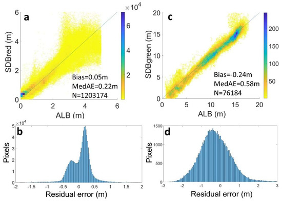 (a) Scatterplot of airborne lidar bathymetry (ALB) (April 2016) and MSI-derived satellite-derived bathymetry (SDB) red at 10 m spatial resolution for the scene acquired on 10 November 2016 in Key West; (b) residual errors for SDBred; (c) scatterplot of ALB (February 2017) and MSI-derived SDBgreen at 10 m spatial resolution for the scene acquired on 6 January 2017 in West Palm Beach; and (d) residual errors for SDBgreen. Lines indicate 1:1 lines. The colors of the scatter plots represent the number of pixels falling within 0.1 m bins of depth (see color bar for each figure).