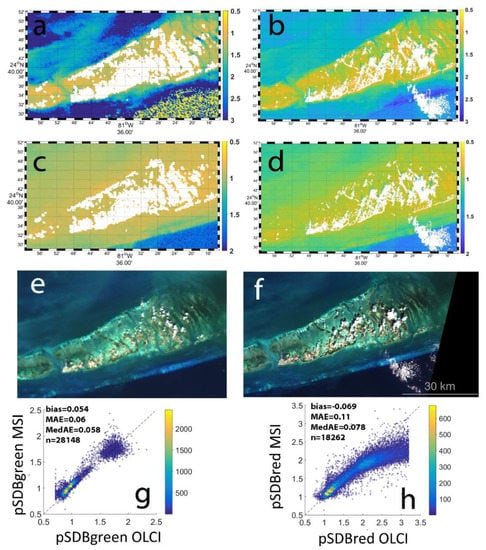 Sentinel-3 OLCI was used in this study to examine the consistency of Sentinel-2 because its more frequent coverage allowed more comprehensive and repetitive assessments of model performance. In order to evaluate Sentinel-2 products after ACOLITE atmospheric correction, we made an intercomparison and cross-calibration of MSI against products derived from OLCI. This cross-sensor methodology is a standard procedure established in the remote sensing optical community when in situ reflectance data are not available [28,29,51]. Comparison depended on close similarity in products. OLCI- and MSI-derived outputs acquired on 8 February 2017 in Key West region are shown in Figure 3. The image pairs were taken near-simultaneously (within 45 min: OLCI at 15:22 GMT and MSI at 16:04 GMT), thus similar atmospheric and turbidity conditions could be assumed. To allow for comparable OLCI–MSI product estimations, the MSI products were aggregated to 300 m. Same day matches with low cloud cover and sunglint were rare. OLCI products (300 m, red-green-blue (RGB_ in Figure 3e), which were intended for ocean color applications, may be regarded as a radiometric-based reference for the MSI product (10 m, RGB in Figure 3f). The resulting maps of pSDB (prior to vertical referencing) allowed us to examine consistency between the sensors. The pSDB image maps were similar, although the coarse spatial resolution of OLCI (Figure 3a,c) was noticeable compared to MSI (Figure 3b,d), especially around land. In the offshore, OLCI pSDBred showed larger values (~3, Figure 3a) compared to MSI (~2.5, Figure 3b), but these data were not significant because the region corresponded to optically deep water with actual depths >30 m. The pSDBred from the two sensors (Figure 3h) compared well between low and medium values (0.7–2.5), with small bias and error (Table 5) and the majority of the data laying along the 1:1 line. At pSDB depths >2.5, MSI was underestimated, consistent with a lack of detection at deeper depths because of the lower sensitivity (Table 5). Given that OLCI is an ocean color sensor, it was designed with more radiometric resolution (14-bit data) and greater sensitivity (specifically, signal-to-noise ratio, or SNR) than the MSI, a land-focused sensor; this result was expected [29]. With pSDBgreen there was no apparent difference (probably because we did not reach the maximum detectable depths for SDBgreen in this analysis), with slight overestimation by MSI (Figure 3g, Table 5). Overall, pSDBred and pSDBgreen for the two sensors agreed, the bias and MedAE were about 10% of the minimal values for pSDBred and less for pSDBgreen. Similar results were found for the comparison between pSDB using band 490 (Table 5).