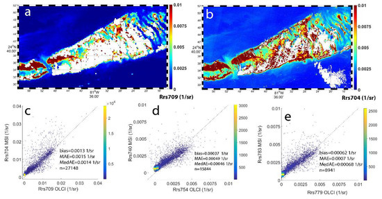 (a) Rrs709 in Key West on 8 February 2017 derived from OLCI (300 m); (b) Rrs704 in Key West on 8 February 2017 derived from MSI (10 m); (c) OLCI-derived Rrs709 versus MSI-derived Rrs704; (d) OLCI-derived Rrs754 versus MSI-derived Rrs740; and (e) OLCI-derived Rrs779 versus MSI-derived Rrs783. To allow for comparable OLCI–MSI product estimations, the MSI products were required to be aggregated to 300 m.