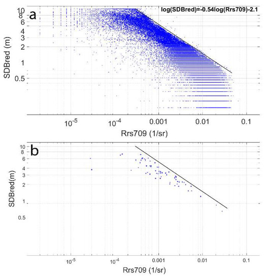 (a) Comparison of depth from SDBred against turbidity estimated with Rrs709 derived from OLCI data (January–August 2017) in Key West. Only pixels retrieved with airborne lidar bathymetry (ALB) were included in the analysis; (b) Rrs709 versus SDBred only for one pixel with bottom depth of 5 m (ALB = 5 m). The threshold derived from the linearization in Figure 5a is shown (black line).