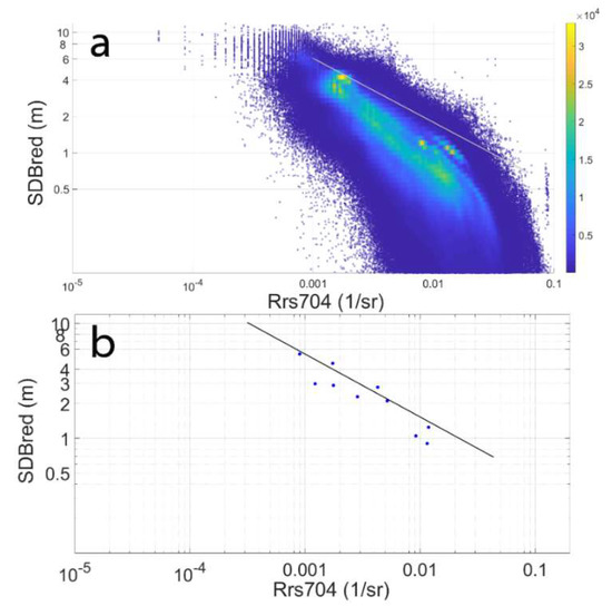 (a) MSI-derived Rrs704 versus SDBred using band 445 at 10 m resolution for the time series from December 2015 to May 2017 (14 images); (b) Rrs704 versus SDBred for one pixel with known depth of 5 m (ALB = 5 m). The threshold derived from OLCI data (Figure 5a) is indicated with the line.