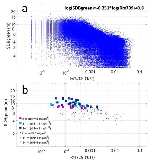 (a) Rrs709 versus SDBgreen derived from OLCI (January–August 2017) in Key West, the threshold derived from the linearization is indicated (black line); (b) Rrs709 versus SDBgreen in three pixels at chart depths of 8 m, 11 m, and 14 m for chlorophyll concentration (chl) lower or equal (squares) and higher (dots) than 1 mg/m3 following a recent study [58].