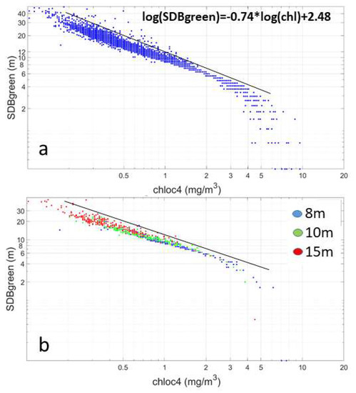 The same temporal inspection of SDBgreen was accomplished in Key West with inclusion of new pixels up to ~18 m selected from charts. The pSDBgreen was vertically referenced to the chart datum using the image acquired on 15 May 2017. SDBgreen (using band 490 nm) was constrained by Rrs709 (Figure 7a), where a maximum Rrs709 followed a threshold where lnSDBgreen = −0.251 × lnRrs709 + 0.8. Using band 445 nm for SDBgreen produced an equivalent result: lnSDBgreen = −0.253 × lnRrs709 + 1.12. This threshold was not as well-defined as for SDBred; the relationship between Rrs709 and SDBgreen showed higher pixel-by-pixel scatter compared to SDBred in Key West (Figure 6b). This scatter may be due to algae absorption in addition to sediment scattering, as chlorophyll influences the blue more severely (by pigment absorption) than the green (chlorophyll was estimated with the standard OC4 blue to green band ratio algorithm). Previous work estimated the influence of the variation of chlorophyll concentration on depth estimations, suggesting that SDB methodology remained valid under a low (<1 mg/m3) and constant chlorophyll concentration (10% of variation in the image) to limit the variation of bathymetric error (15.5%) [58]. That study concluded that when the choice is possible, the scene containing the “clearest (lowest chlorophyll)” water on the training area must be retained. Following their study, we selected the boundary between low and high chlorophyll as 1 mg/m3 in three different pixels at chart depths of 8, 11, and 14 m (Figure 7b). Higher chlorophyll concentration produced shallow depths (shoaling) in the SDB independently of Rrs709.