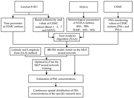 Taking advantage of the wide spatial and temporal coverage, it has been generally proved that the various satellite remote sensing images could be employed for the estimation of the PMx concentrations in large geographic areas. In order to obtain the continuous spatial distribution of PMx concentrations in various cities of China, this research develops new BR-PMx models for the estimation of PMx (including PM10 and PM2.5) concentrations based on the algorithm of a multilayer perceptron neural network combined with LLZ method. In the BR-PMx models, the primary source data were from Landsat 8 OLI and in the meantime, various meteorological factors and the time parameter have been taken into consideration. To the best of our knowledge, the Landsat 8 OLI satellite data have been seldom investigated for the PMx concentration estimations in the literature published so far.