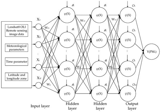 In this paper, the BPN (back-propagation network) is selected for PMx concentration estimation. BPN is a multilayered network for weights’ training with forward nonlinear differentiable functions. The BPN neural network consists of input layer, multiple hidden layers and the output layer (see Figure 2). Each of these layers is connected to all of the cells in the adjacent layer. Simultaneously, there is no connection between the cells of the same layer. Once a pair of learning samples is provided to the network, the activation value of the neuron propagates from the input layer to the output layer, and the neurons in the output layer obtain the input response of the network. After that, the connection weights are modified layer by layer from the output layer through the middle layer and then back to the input layer.
