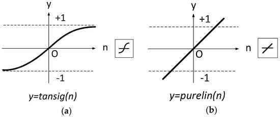 For the topologic design of the neural network, the tansig function (tan-sigmoid transfer function, see Figure 4a) is utilized for transmitting the neurons of each layer [42]. The purelin function (linear transfer function, see Figure 4b) is employed as the transfer function of the output layer [43,44]. The number of intermediate nodes of the hidden layers is enlarged from 5 to 20 in a stepwise fashion using the Kolmogorov theorem to establish the nodes of the network structure [45]. Based on the growth method of the network structure, the best number of nodes of the hidden layers is selected as (15, 15) for the continuous training of the network.