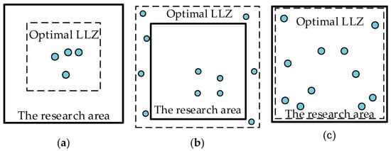 The diagrammatic sketch of the ‘optimal’ LLZ which could be (a) smaller, (b) larger or (c) quite similar to the MER of the specific research area; rectangle with solid line: MER of the research area; rectangle with dashed line: optimal LLZ; blue dots: the monitoring stations.