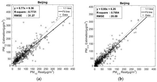 Scatterplots between PMest and PMrea of (a) the BR-PM2.5 model and (b) BR-PM10 model in the whole area of mainland China, where the solid line represents the fit line obtained.
