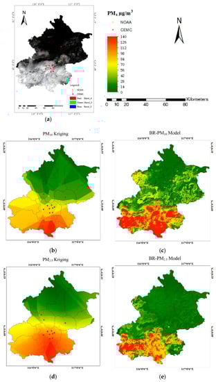 To obtain the continuous distribution graph of the PMx concentrations of the research area, one of the common methods is to operate the spatial interpolation based on the discrete PMx values at various points. Figure 10b,d and Figure 11b,d are such spatial distribution graphs calculated by the Kriging interpolations based on the monitoring PMx values from the 12 CEMC stations located in the area of Beijing, China. Figure 10c,e and Figure 11c,e are the spatial distribution graphs of the PM10 and PM2.5 concentrations estimated by the proposed BR-PMx models in this research. All of these graphs have the spatial resolution of 30 m.