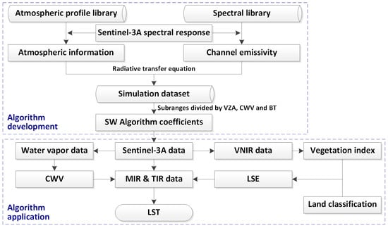 As seen from Equation (1), retrieving LST from the thermal radiance measured at the TOA must eliminate the influences of both atmosphere and emissivity. For the atmosphere part, we use a modified SW algorithm to remove its effect, while for the emissivity part, land classification product and vegetation cover information are used to estimate LSE. Figure 1 presents the technique process of the study, in which atmospheric profiles and surface spectra are first used to generate the simulation dataset. The simulation dataset is then divided into several subranges, according to the view zenith angle (VZA), column water vapor (CWV) and brightness temperature (BT), and the algorithm coefficient is calculated in each subrange separately. Finally, LST of each case can be estimated by using the corresponding algorithm coefficient. Details are introduced in the following part.