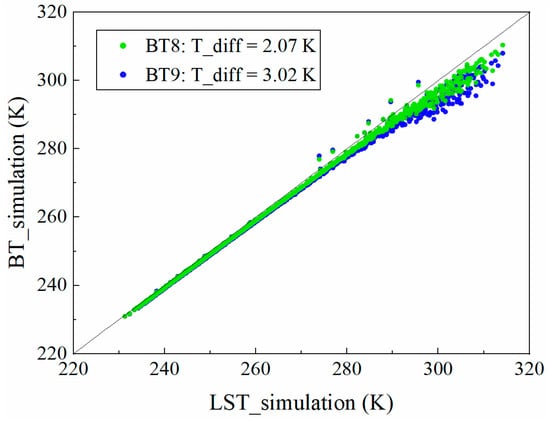 Moreover, considering that LST might vary tremendously under different conditions, the simulated data were divided into several subranges, according to their temperature under each CWV subrange. Since the true LST was undetermined, brightness temperature (BT) was used for the division. Figure 3 shows the relationship between simulated LST and BT of the two TIR channels (denoted by BT8 and BT9, respectively). The root-mean-square error (RMSE) between simulated LST and BT was denoted by T_diff in Figure 3, from which it was found that BT8 was closer to LST, with a temperature difference of about 2.07 K. Therefore, BT8 was chosen for subrange division. For daytime and nighttime algorithms, BT8 was divided into four subranges, as follows: (0, 285) K, [285, 300) K, [300, 315) K, [315, +∞) K and (0, 280) K, [280, 290) K, [290, 300) K, [300, +∞) K, respectively. As a result, the simulated data were divided into 160 subranges, i.e., 5 VZAs × 4 CWVs × 4 BT8s × 2 times (day and night). For each subrange, the algorithm coefficients of Equations (2) and (3) were calculated by regression analysis separately and stored in a lookup table.