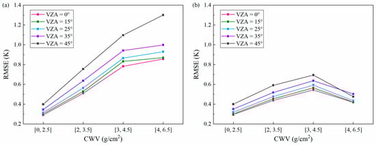 Variation of the temperature RMSE (without noise) as the column water vapor (CWV) changes under different VZAs for (a) daytime algorithm and (b) nighttime algorithm.