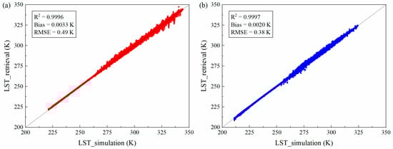 Table 1 and Table 2 show the coefficients and the corresponding RMSEs when VZA = 0° for the daytime and nighttime algorithms, respectively. Considering that the retrieval accuracy might be sensitive to the uncertainty of LSE, a random noise of Gaussian distribution with zero mean and 0.01 standard deviation was introduced to LSE, and Equations (2) and (3) with original coefficients were then used to calculate a biased LST. The RMSEs with the random noise in LSE are also listed in Table 1 and Table 2. Figure 4 presents the histograms of LST residual errors (ΔT) for both algorithms. It can be discovered that the absolute value of most residual errors is less than 1 K. For the daytime algorithm, the ratio of < 1 K is 96.4%, while that for nighttime is 98.7%. Figure 5 presents the variation of the temperature RMSE (without noise) as the CWV changes under different VZAs. Results suggest that (i) the RMSE shows an increasing trend as the CWV increases, and decreases if the MIR channel is involved in the nighttime algorithm, especially with the case of a large CWV level; (ii) the RMSEs with noise are generally lower than 2 K for the daytime algorithm and 1.5 K for the nighttime algorithm, and the nighttime algorithm is less sensitive to the uncertainty of LSE; and (iii) a larger VZA leads to a larger RMSE. After constructing the algorithm, 30% of the simulated data are used as a test set to evaluate the algorithm. The test results are displayed in Figure 6. The retrieved LST and the simulated LST show a strong correlation with a small error. For the daytime algorithm, the regression determination coefficients are: R2 is 0.9996, bias is 0.0033 K, and RMSE is 0.49 K, whereas for the nighttime algorithm, R2 is 0.9997, bias is 0.0020 K, and RMSE is 0.38 K. It illustrates that LST can be estimated with the proposed algorithm, and the involvement of the MIR channel can reduce the algorithmic error and improve the retrieval accuracy in theory.