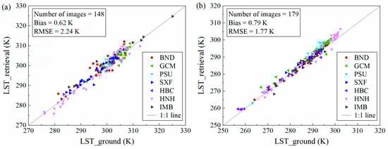 Over the seven sites, a total of 327 clear-sky SLSTR images were collected in 2017 and 2018, including 148 daytime images and 179 nighttime images, and their LSTs were then retrieved using the above proposed daytime and nighttime split-window algorithms, respectively. Meanwhile, in order to make a direct comparison, the corresponding ground-measured LST was calculated from Equations (8) and (10). Because the time of ground and satellite measurement cannot match exactly, the average of the 10-min ground-measured temperature before and after satellite overpassing was used as the reference surface temperature. Figure 9 displays the scatter diagrams between satellite-retrieved LST (denoted by LST_retrieval) and ground temperature (denoted by LST_ground) in both daytime and nighttime observations. Most points were along the 1:1 line. For the daytime and nighttime algorithm, the temperature bias was 0.62 K and 0.79 K and the RMSE was 2.24 K and 1.77 K, respectively. The above-mentioned results indicated that the nighttime algorithm showed higher retrieval accuracy (about 0.5 K) than the daytime algorithm. However, the temperature bias, larger than 0 for both daytime and nighttime, meant that the LST from the satellite was slightly overestimated, especially for high temperature in the nighttime.